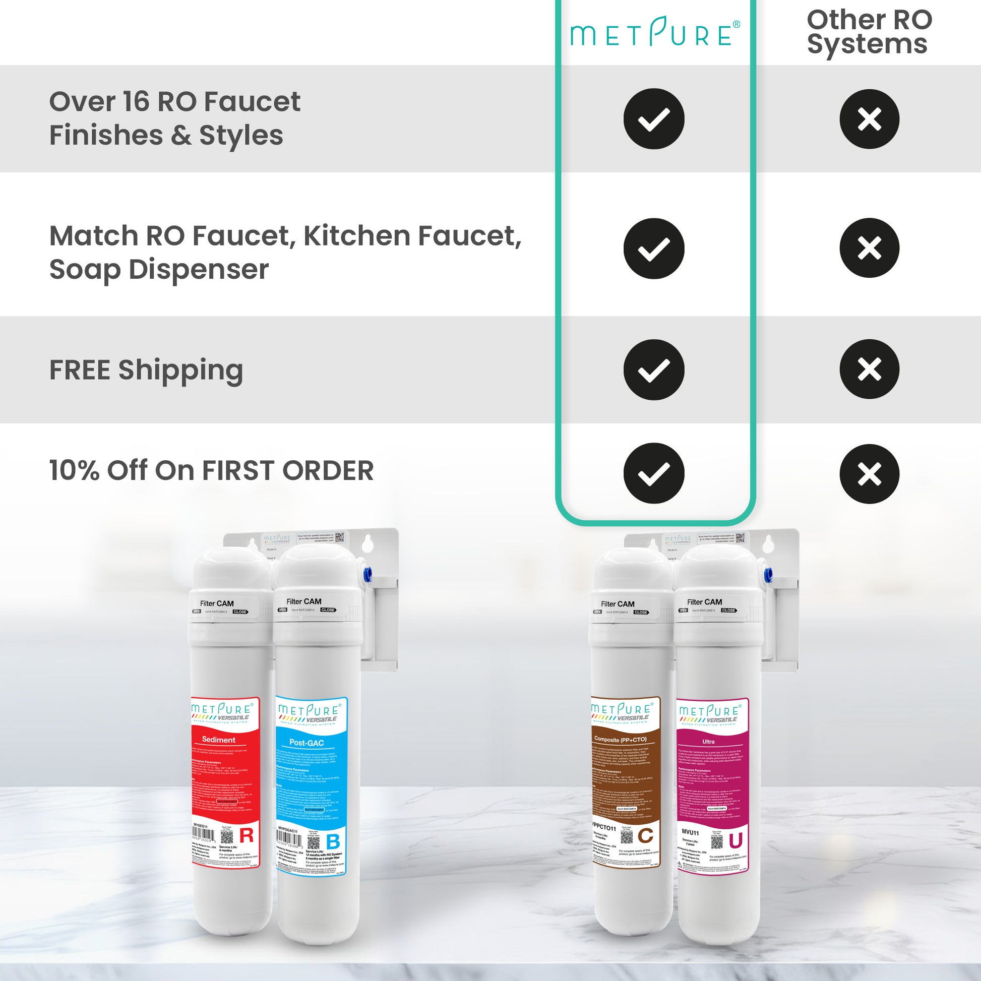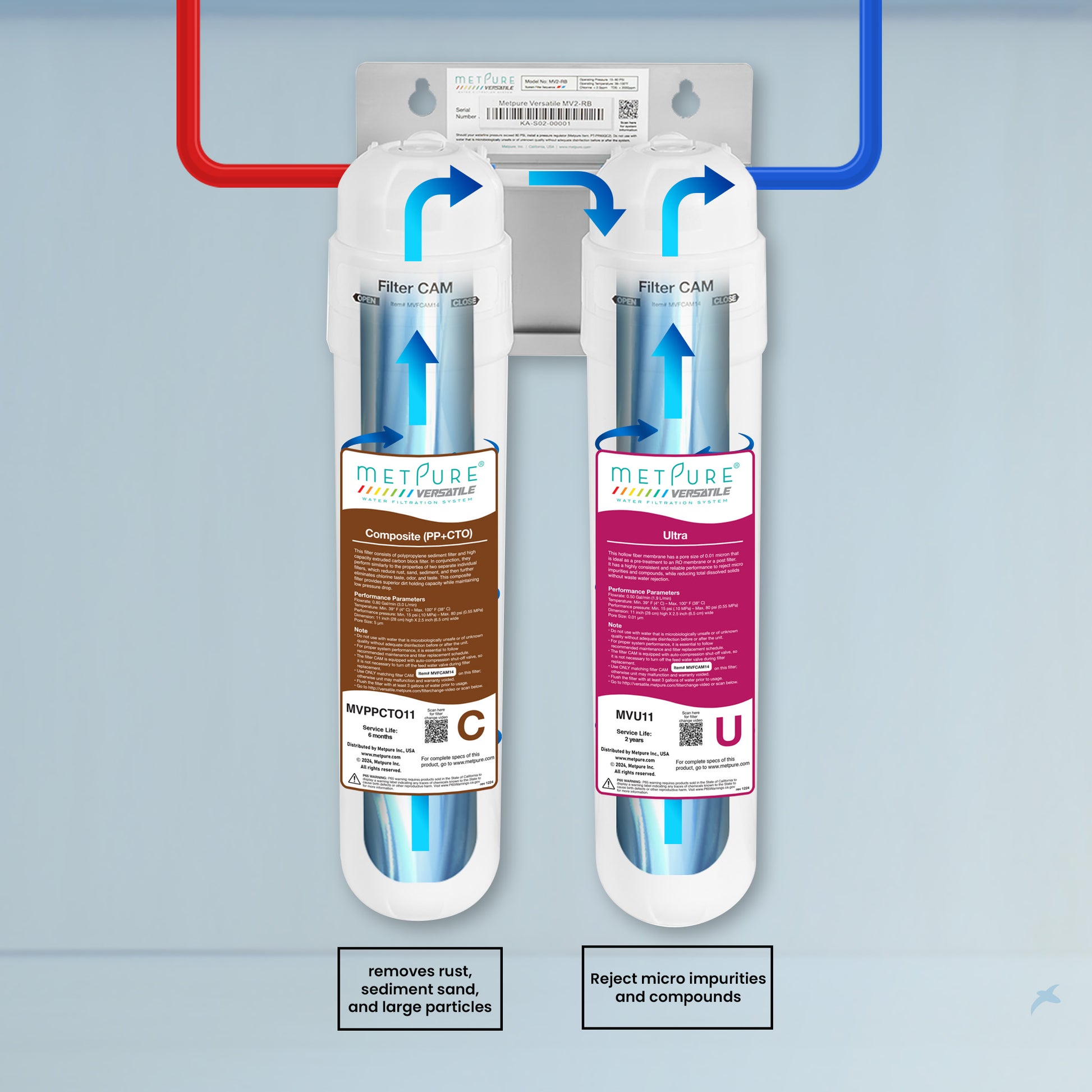 Metpure Versatile quick-twist style water filtration system was designed from the ground up with 3 goals in mind: Superior water purification capability, low-profile footprint, and simple to install and maintain. Needless to say, we have achieved all 3. The first thing you will notice about the system is its compact and lightweight profile, which will significantly save you valuable space in your cabinet. Next, the quick-twist style filter cartridges will put those traditional bulky filter housing systems to shame because these quick-twist filters are easy and fast to change without fuss, stress, or mess. Lastly, Metpure Versatile system assures to produce superior high-quality purified water for your entire family, day in and day out.