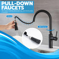 Long Extension Pull-Down Hose: 20” pull-out hose with sprayer nozzle is flexible, pivots, and easily reaches around sink and large items.