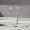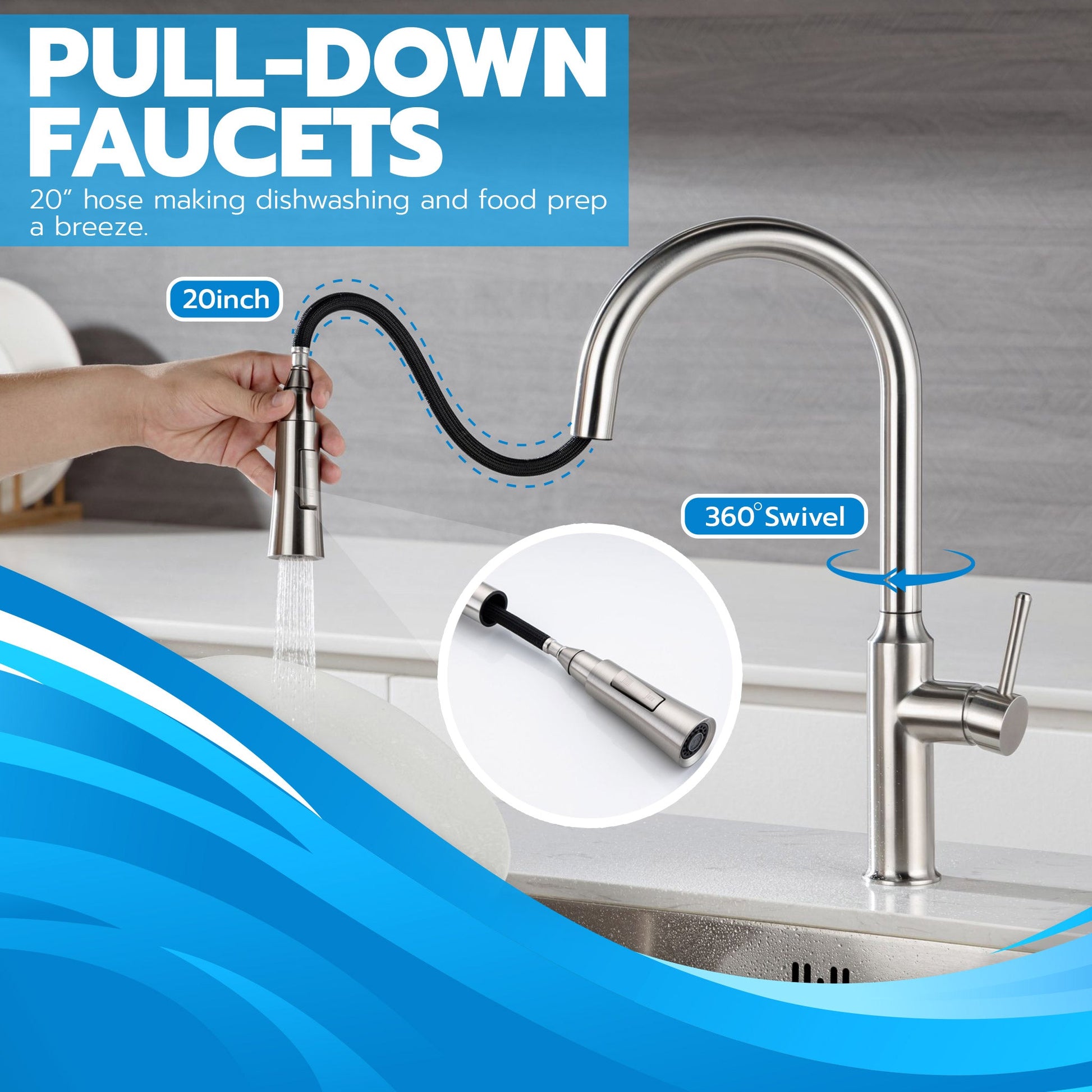 Long Extension Pull-Down Hose: 20” pull-out hose with sprayer nozzle is flexible, pivots, and easily reaches around sink and large items.