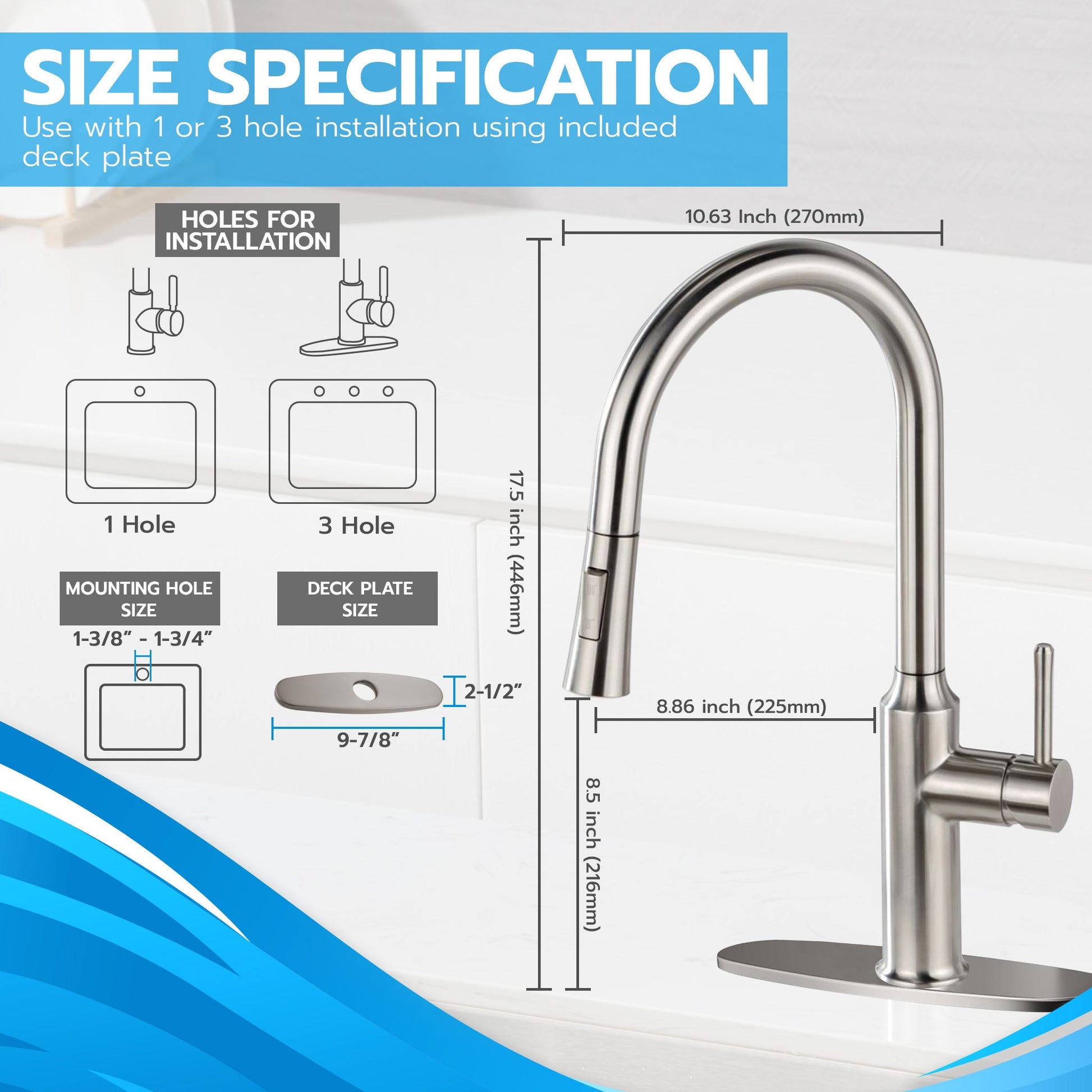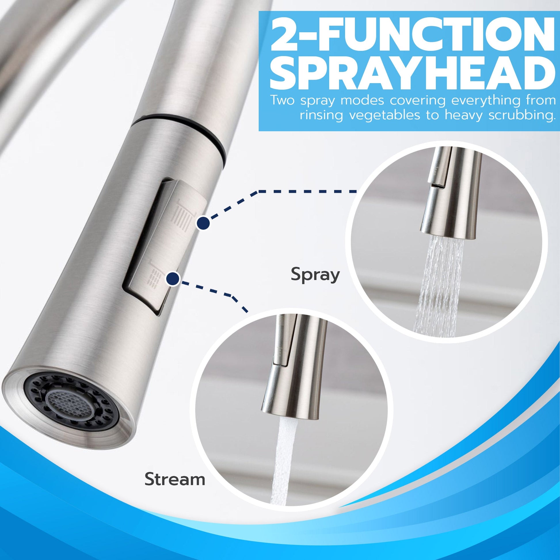 3 Function Sprayer: Stream for fast water fill up, spray, and power spray for powerful cleaning. Complex rubber sprayer hole design provides a soft aerated stream or splash-free spray.
